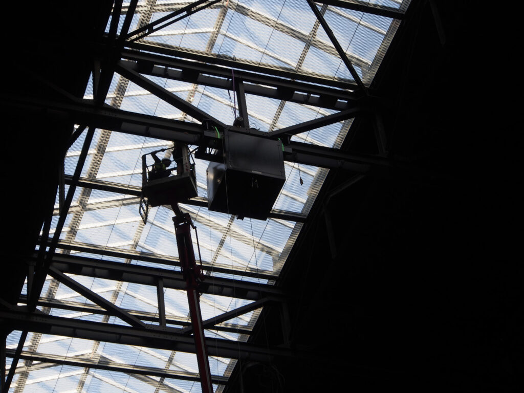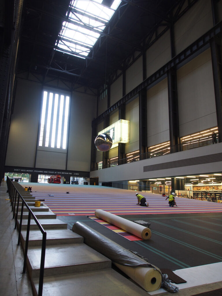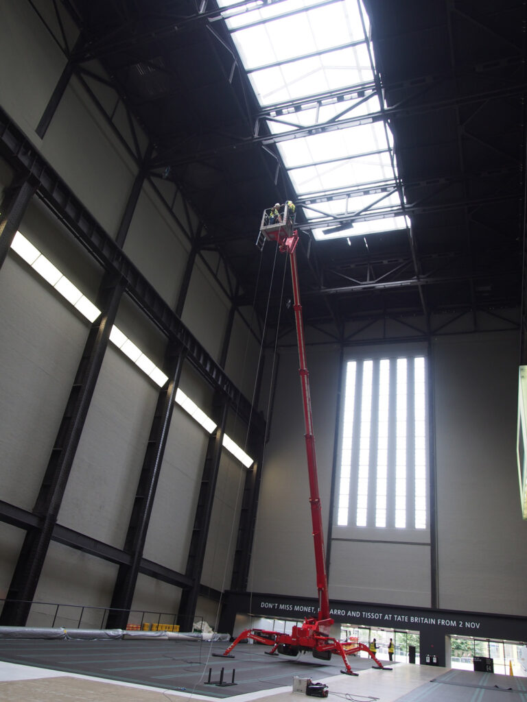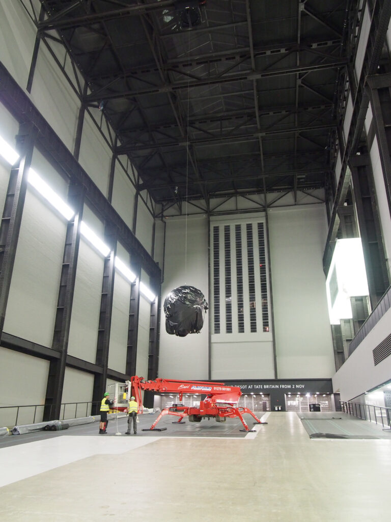 Technical development, production and installation of the pendulum within the interactive large-scale installation „One Two Three Swing!“ of Superflex in the Turbine Hall of TATE Modern (Hyundai Commission 2017). Within the oscillation amplitude of 20 meters, the pendulum rotates permanently once around itself within 31 hours.
