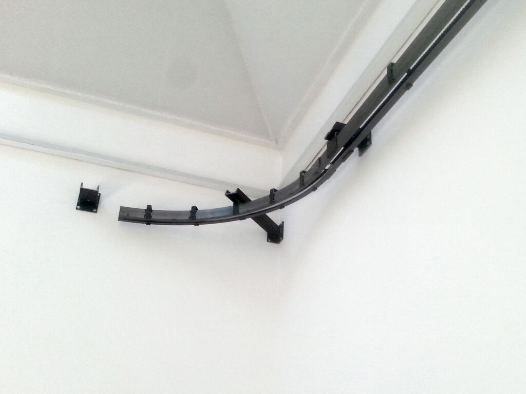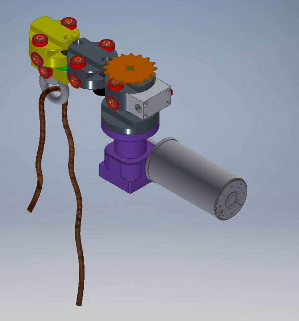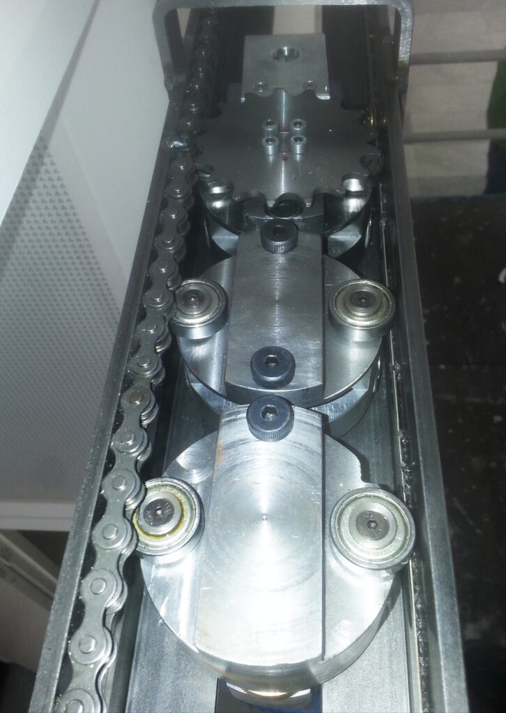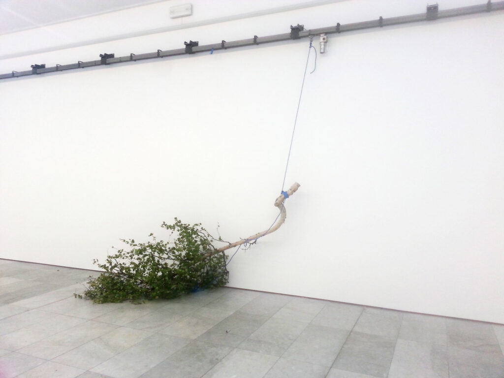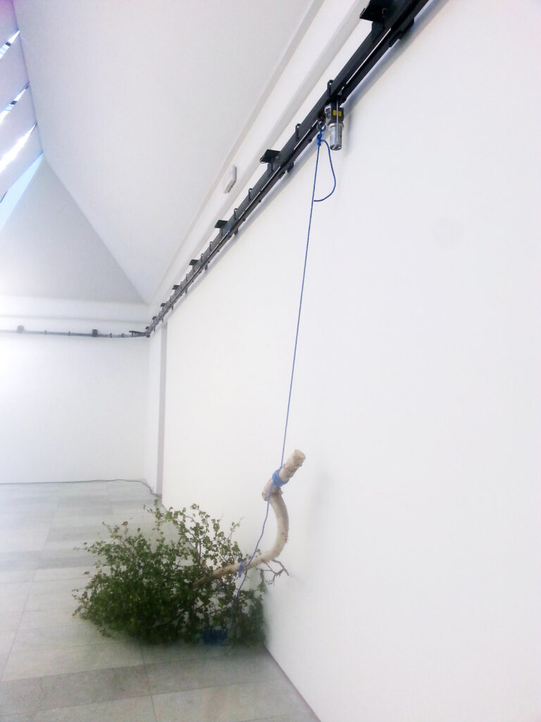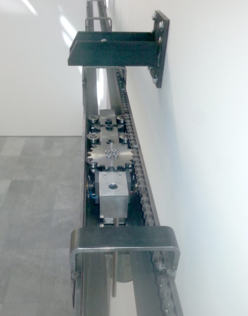 Development and construction of a drive-controlled work of art for Mattias Härenstam on the occasion of the „Lorck Schive“ Art Prize in Norway. Directly under the ceiling, a running track was installed in which a self-moving electric motor runs in a circle and permanently pulls a tree attached to a rope along the wall and floor.