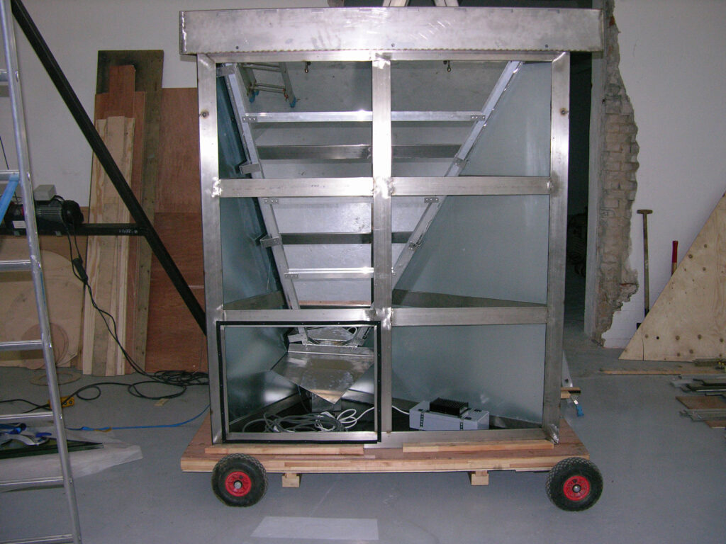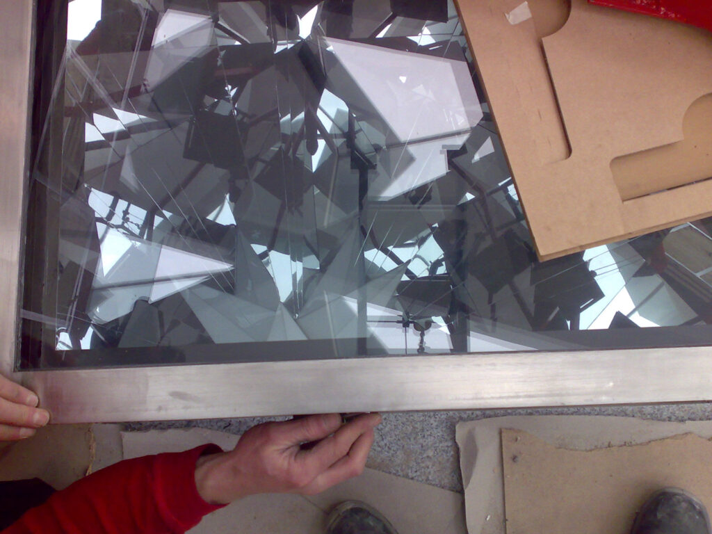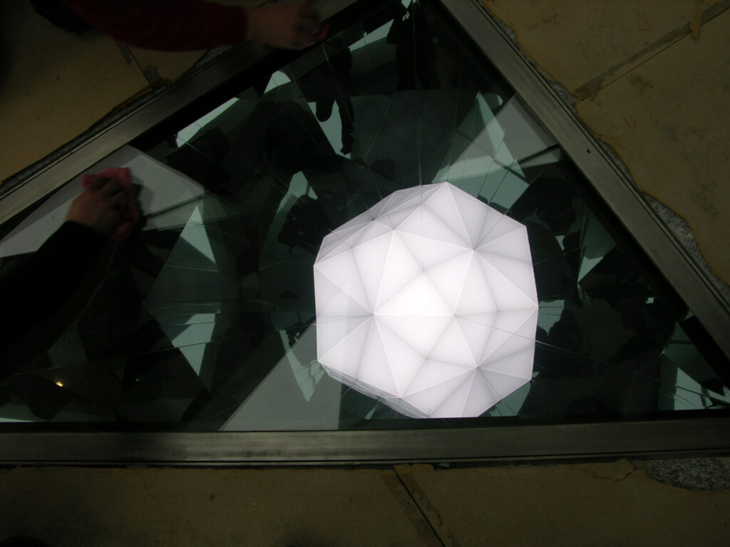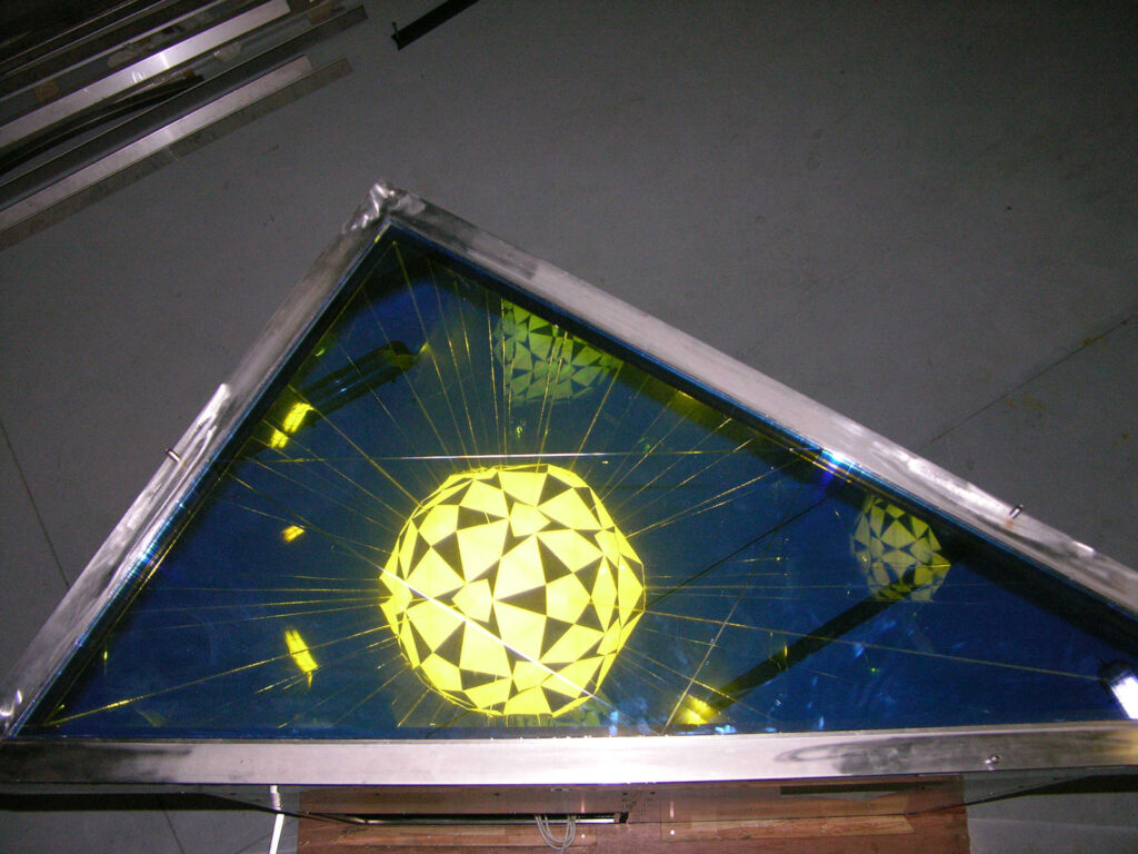 Design and construction of a series of reflective artworks by Olafur Eliasson. A triangular mirror, ca. 2m large, is arranged in special angles in a stainless steel frame made of a bespoke hollow profile under a dichromatic glass plate. The resulting mirror is set 2.5 m into a specially manufactured base. Through the opening in the top of the mirror body, light shines into the spatial triangle and is infinitely reflected through the incorporated mirror, thus producing a subterranean cosmos of stars. Between 2008 and 2012 a total of 12 kaleidoscopes, each with a star formation, have been built and installed.