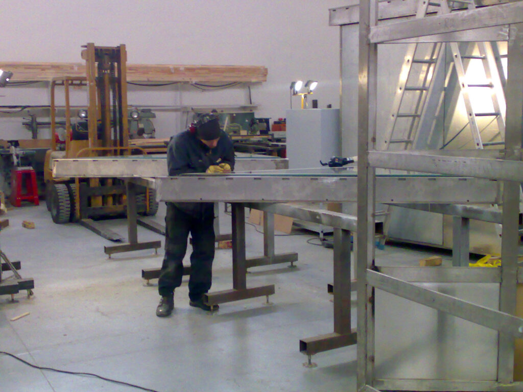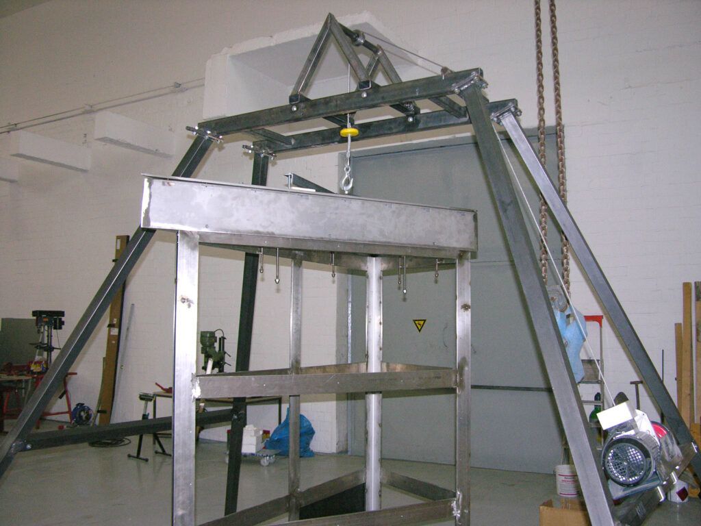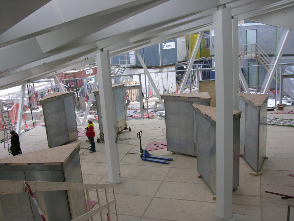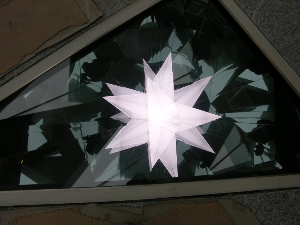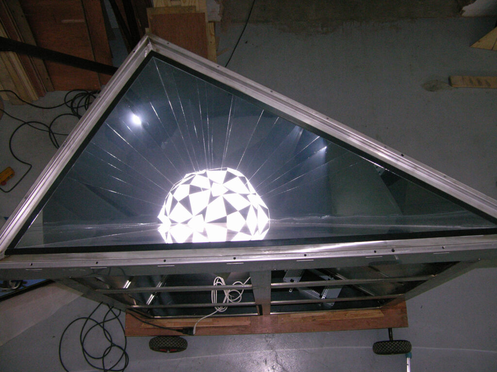 Design and construction of a series of reflective artworks by Olafur Eliasson. A triangular mirror, ca. 2m large, is arranged in special angles in a stainless steel frame made of a bespoke hollow profile under a dichromatic glass plate. The resulting mirror is set 2.5 m into a specially manufactured base. Through the opening in the top of the mirror body, light shines into the spatial triangle and is infinitely reflected through the incorporated mirror, thus producing a subterranean cosmos of stars. Between 2008 and 2012 a total of 12 kaleidoscopes, each with a star formation, have been built and installed.