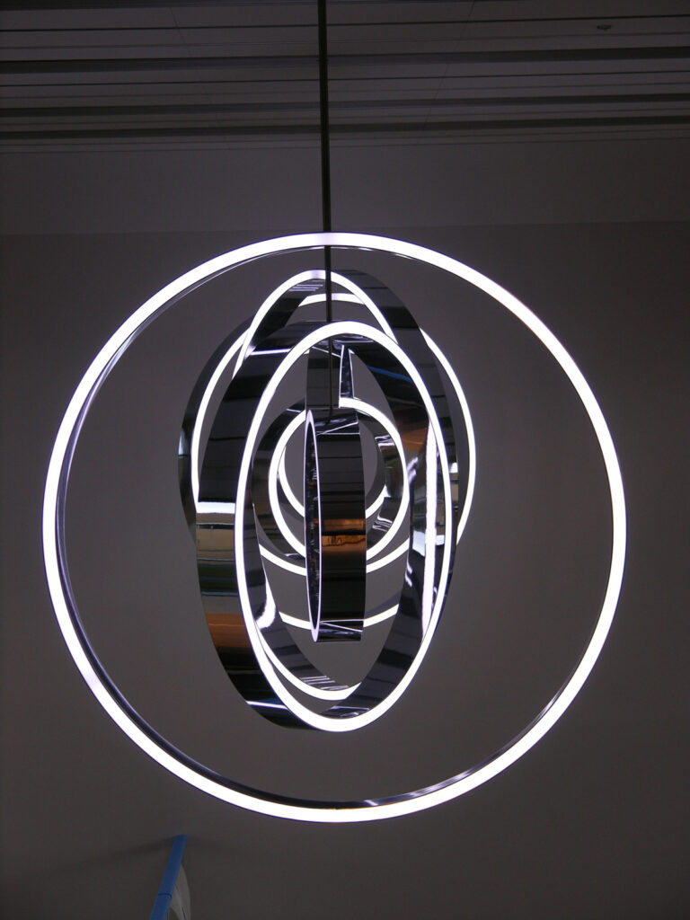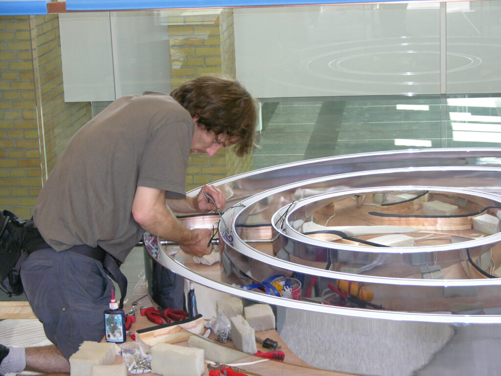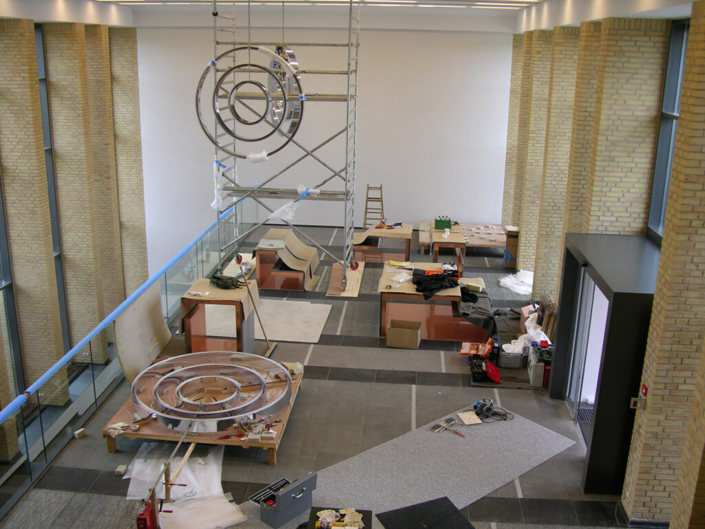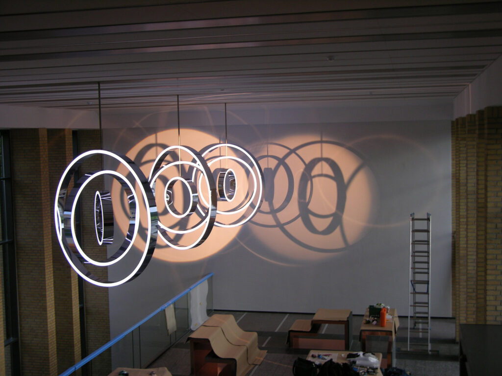 Planning, construction and installation of a mobile for Jeppe Hein, fitted in the foyer of the Sydbank Aabenraa in Denmark. Three inversely rotating light rings with power LEDs are moved independently of each other, powered by PLC-controlled multi-axis drives via VA hollow axles. The shadow impact is produced both by the light ring itself as well as by 2 Source Four projectors. The PLC control and the light source for the entire unit is externally operable through a server rack, situated in the roof of the bank. An e-crane was developed to allow fitting within the flat roof.