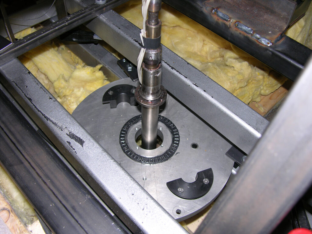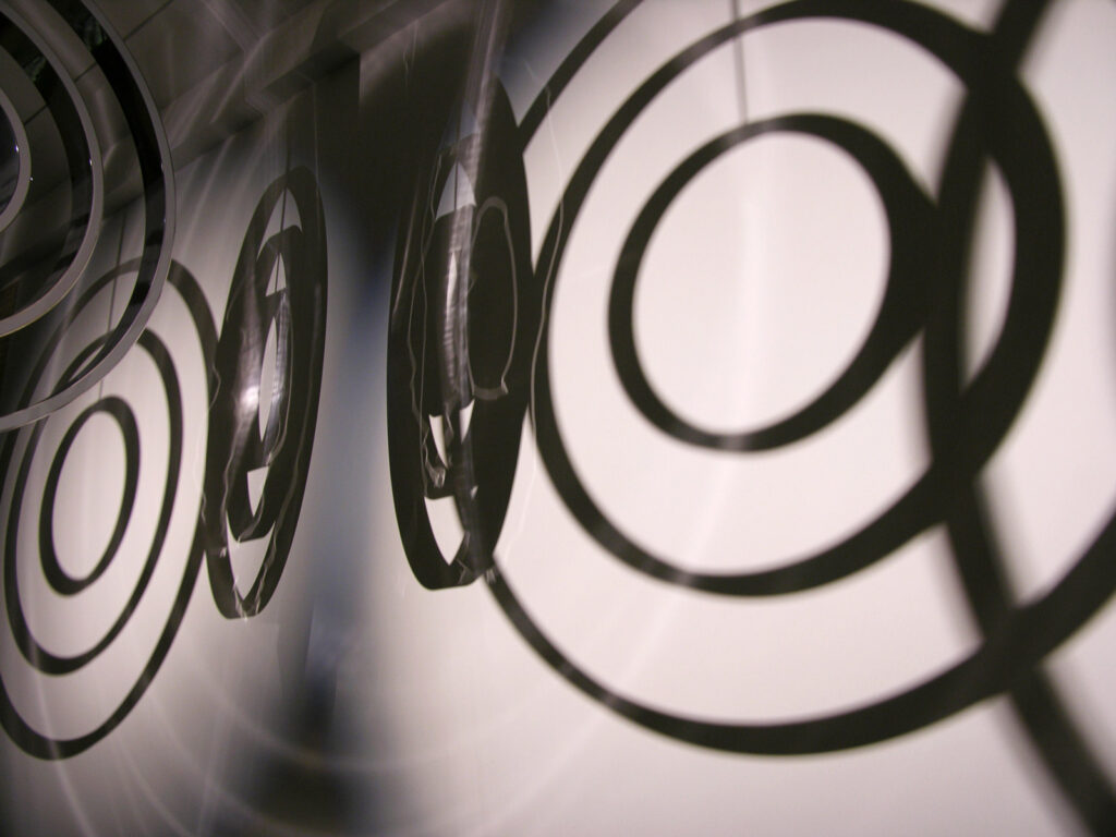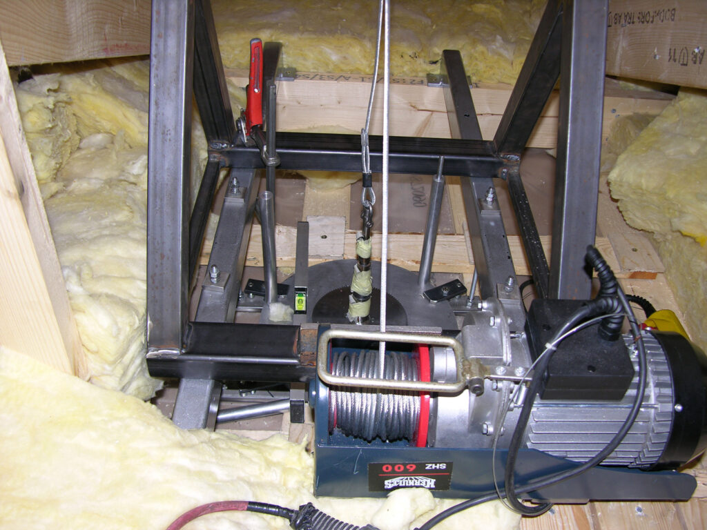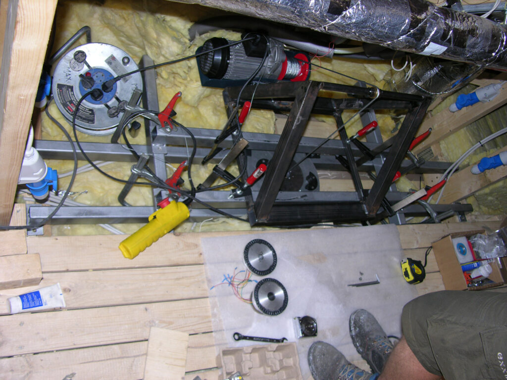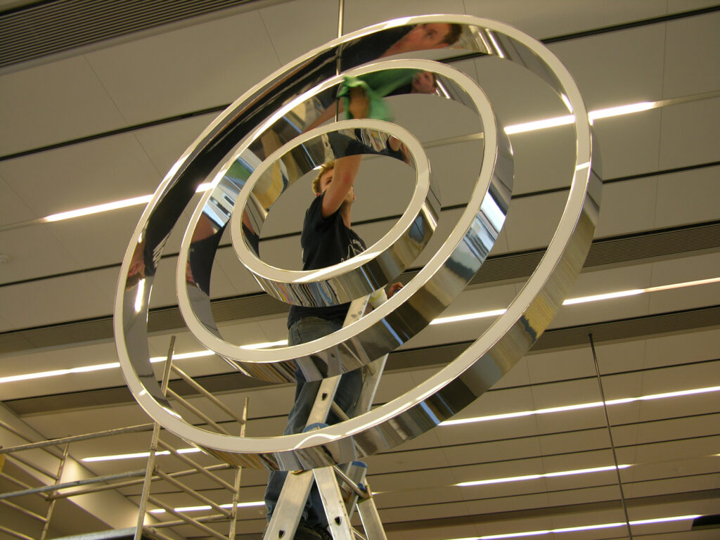 Planning, construction and installation of a mobile for Jeppe Hein, fitted in the foyer of the Sydbank Aabenraa in Denmark. Three inversely rotating light rings with power LEDs are moved independently of each other, powered by PLC-controlled multi-axis drives via VA hollow axles. The shadow impact is produced both by the light ring itself as well as by 2 Source Four projectors. The PLC control and the light source for the entire unit is externally operable through a server rack, situated in the roof of the bank. An e-crane was developed to allow fitting within the flat roof.